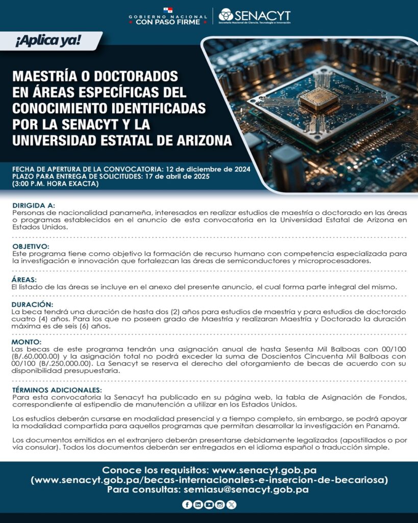 Convocatoria de maestría o doctorado para el área de semiconductores: Dirigida a ciudadanos panameños interesados en cursar estudios de maestría o doctorado en áreas relacionadas con semiconductores en la Universidad Estatal de Arizona, Estados Unidos, con el objetivo de formar talento humano altamente especializado que contribuya a la investigación e innovación en los campos de semiconductores y microprocesadores.